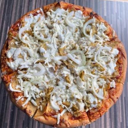 Pizza de 35 cm con base de queso manchego, mozarella y gouda con totopos bañados en salsa verde. Acompañados de crema, queso panela rayado y cebolla.