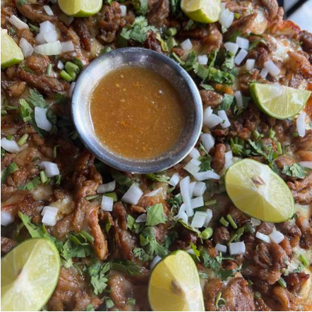 Base de queso con carne al pastor, cebolla, cilantro, limón y salsa de la casa. *Pastor: ch 160gr. | med 230gr. | gde 300gr