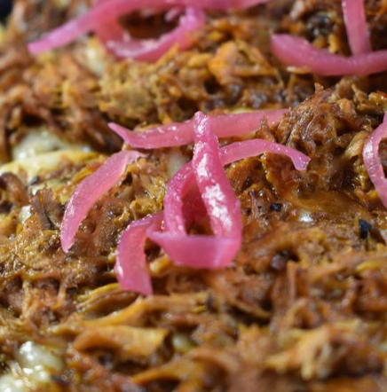 Base de queso con cochinita pibil, cebolla morada, limón y habanero. *Cochinita pibil: ch 224gr. | med 320gr. | gde 500gr.*