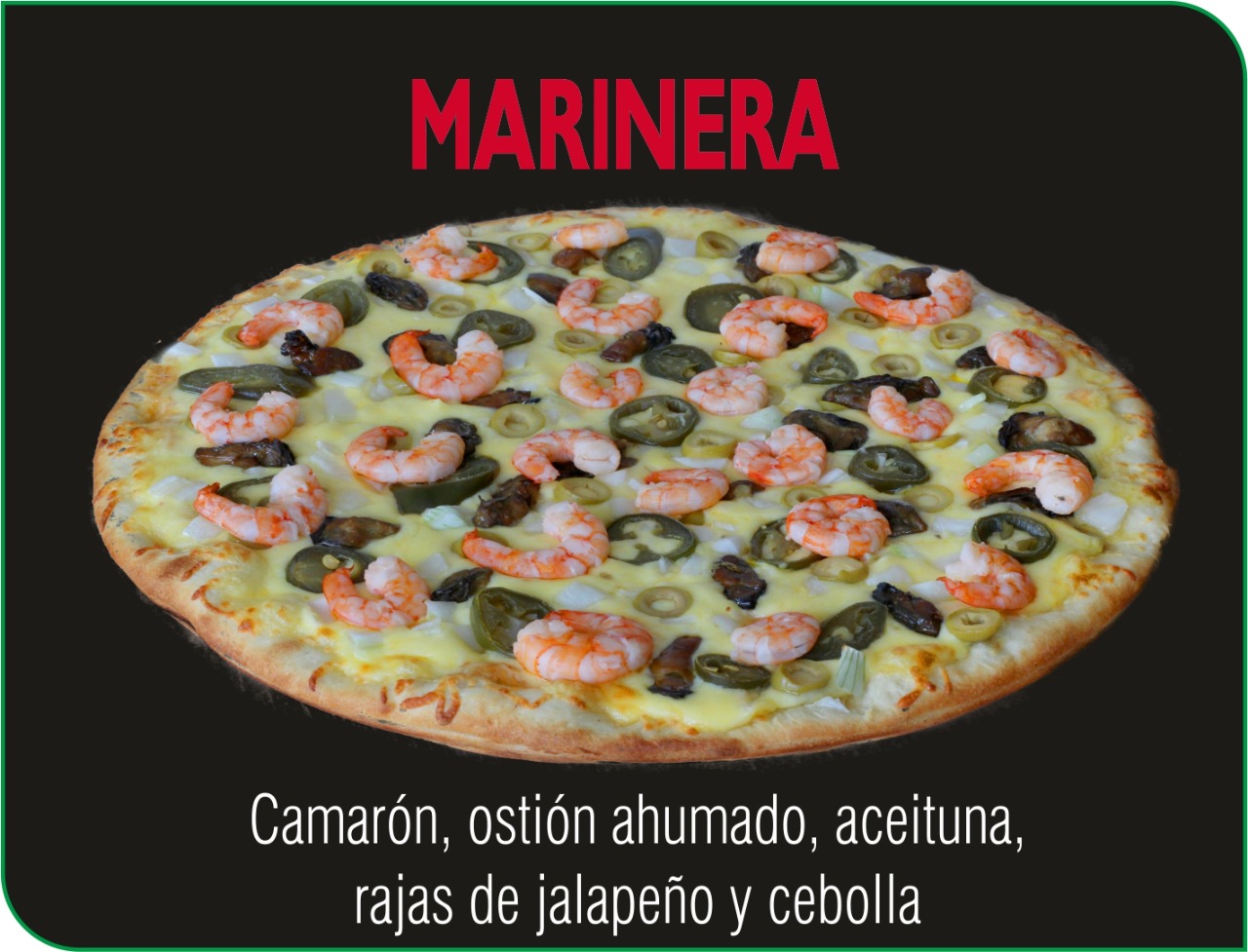 Camarón, ostión ahumado, aceituna, rajas de jalapeño y cebolla.