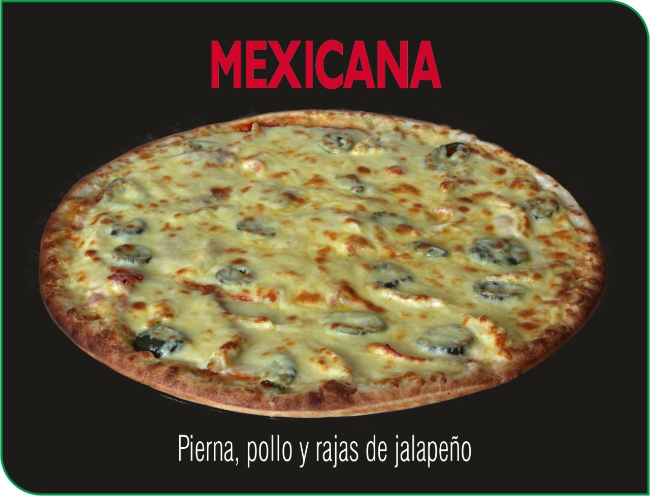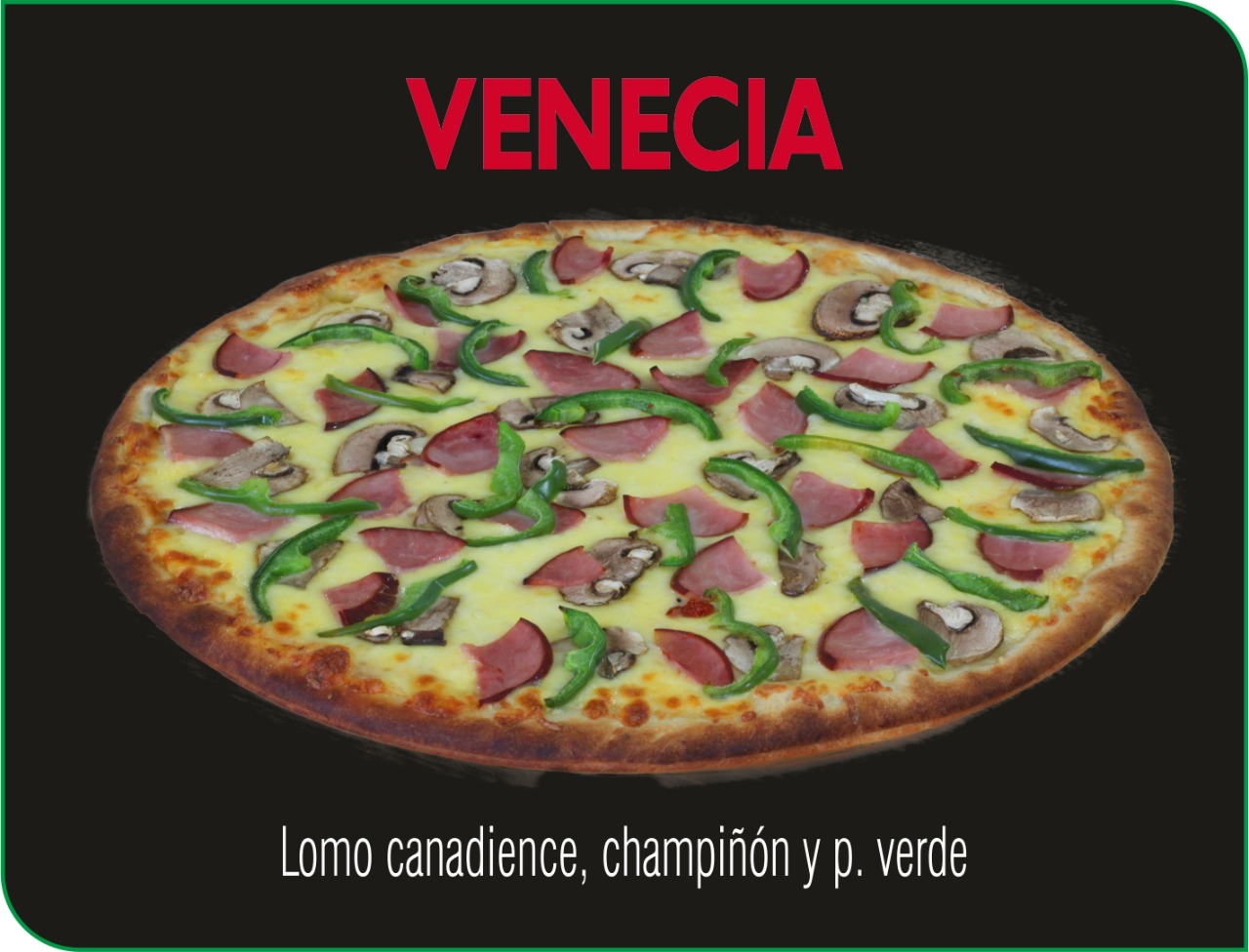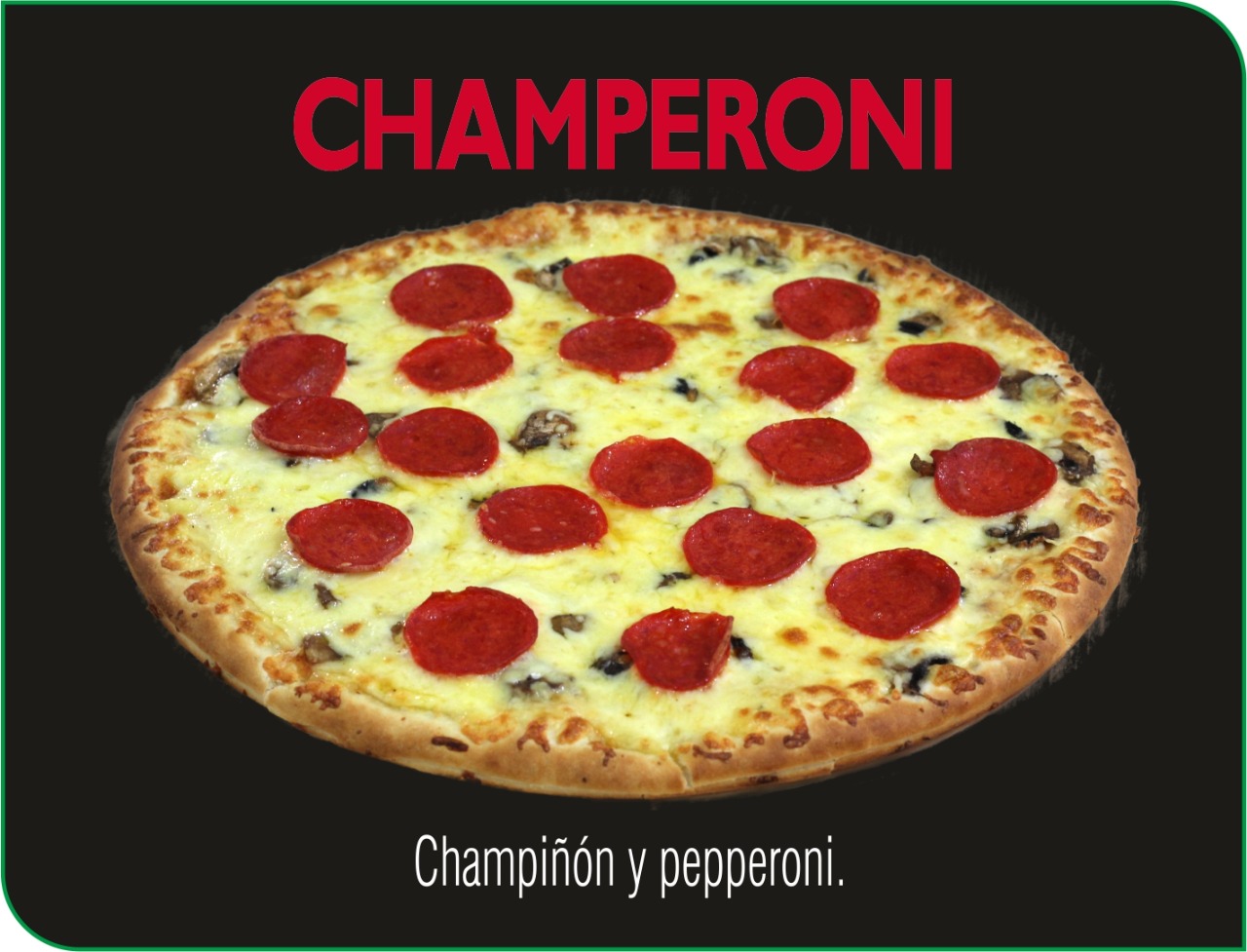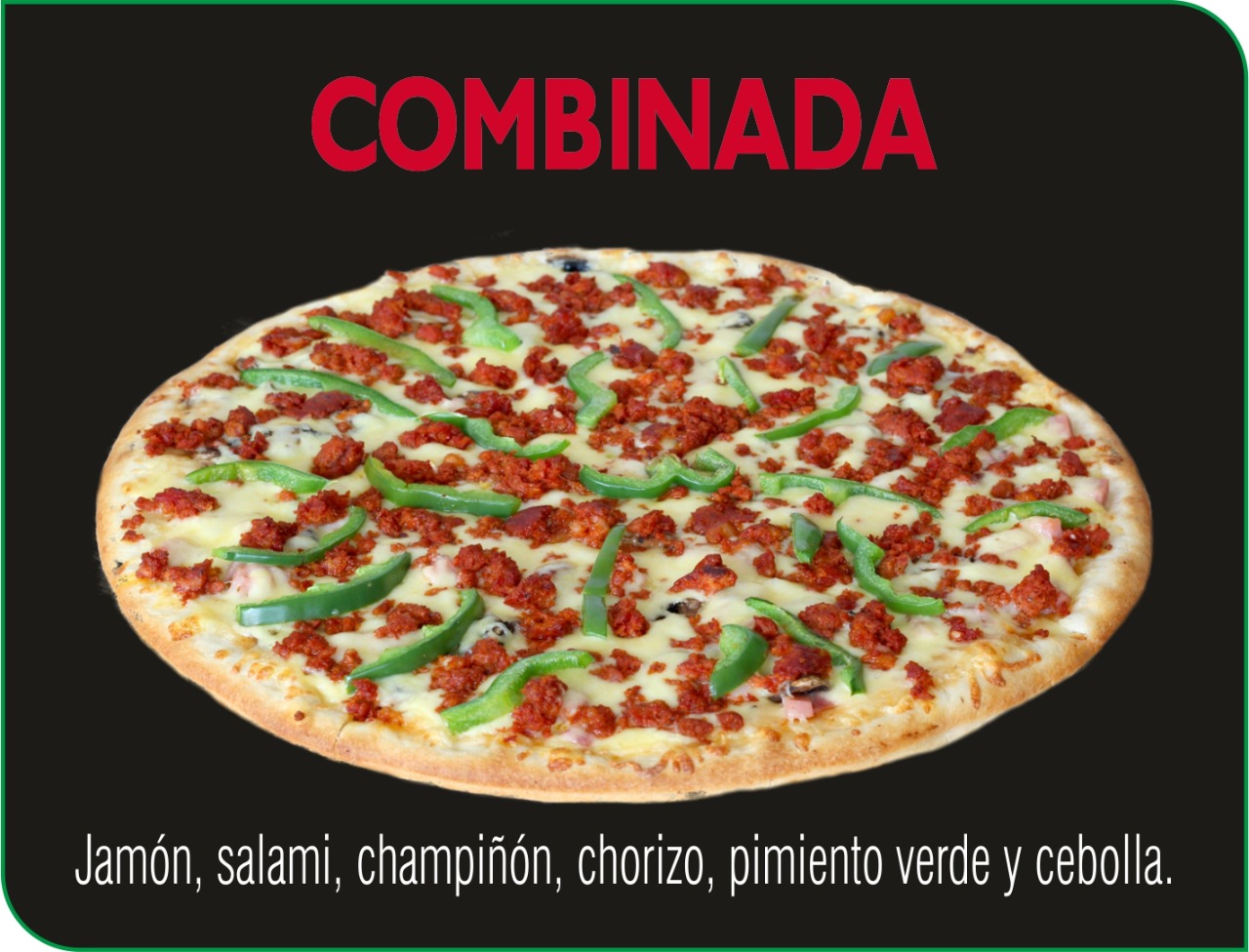 Jamón, salami, champiñón, chorizo, pimiento verde y cebolla.