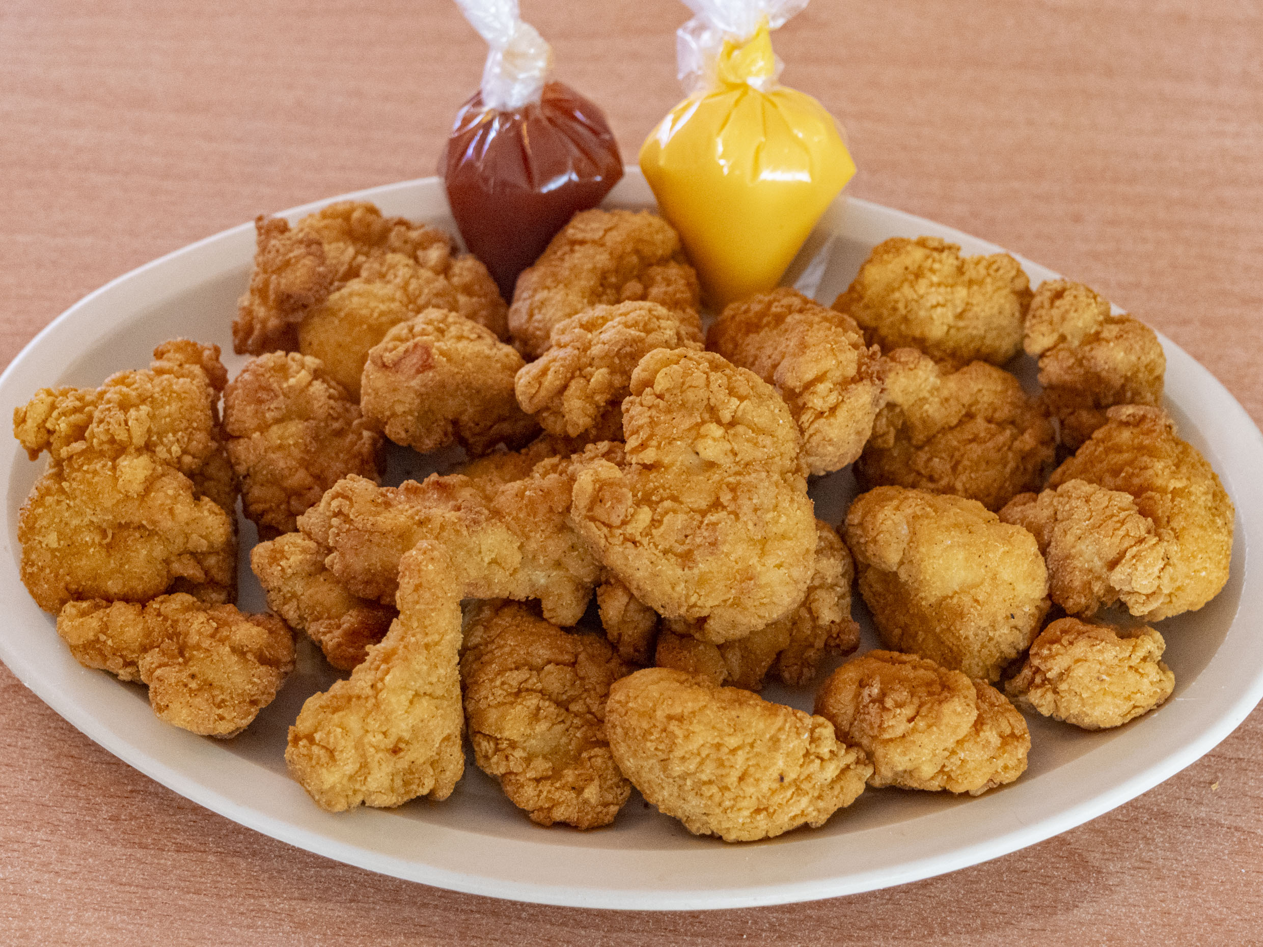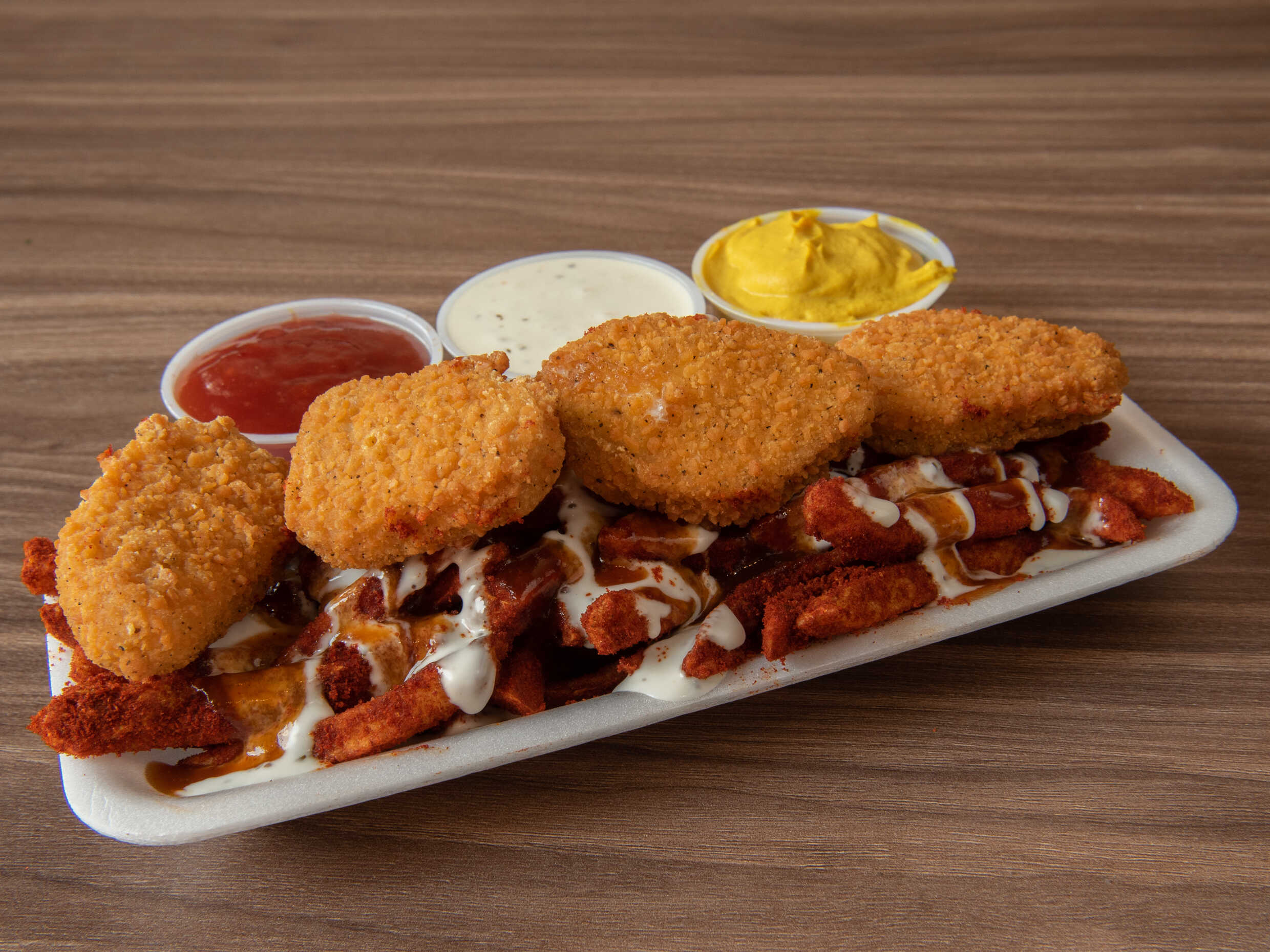 Ricos nugggets de pollo (10 Pzs) con papas a la francesa, acompañados de salsa de queso y cátsup. (Para máx. 2 personas)