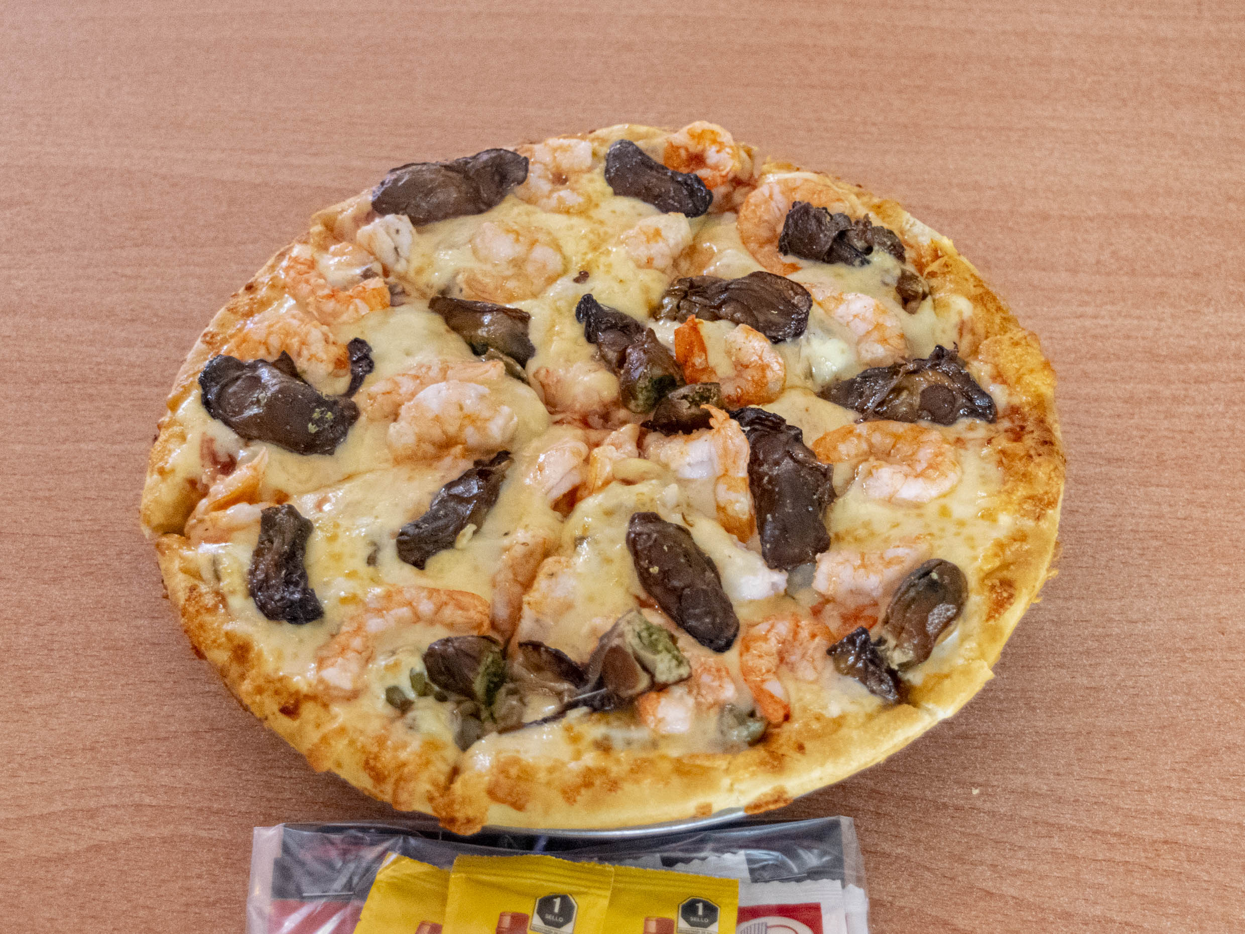 2 pizzas. Camaron, ostion ahumado, aceituna, rajas de jalapeño y cebolla