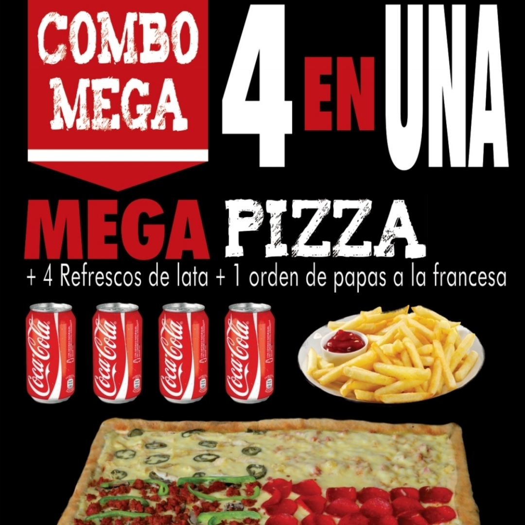 Mega Pizza 4 en 1*1 + Papas a La Francesa*1 + Refresco de Lata*4
