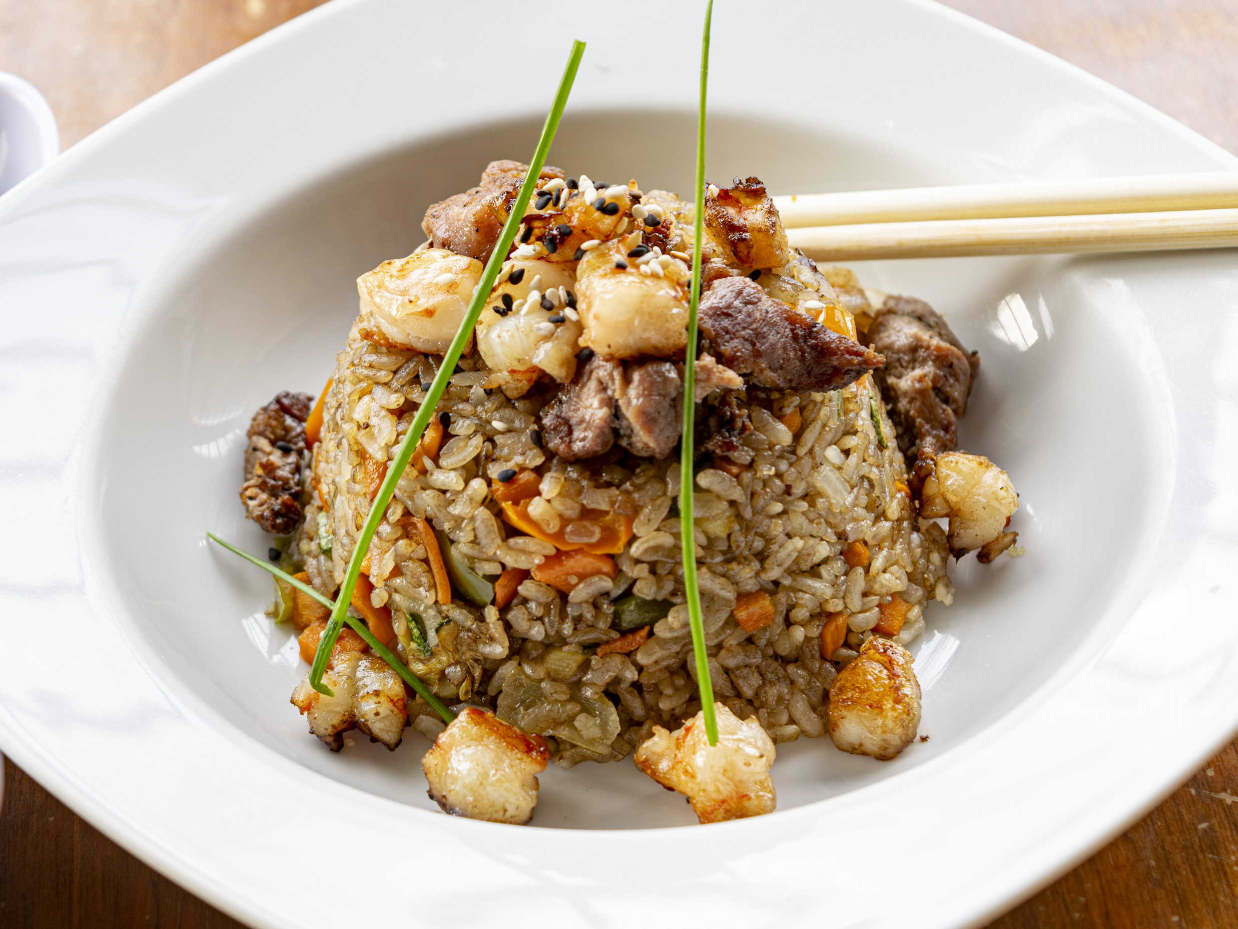 Arroz frito con verduras y exquisito filete de res.