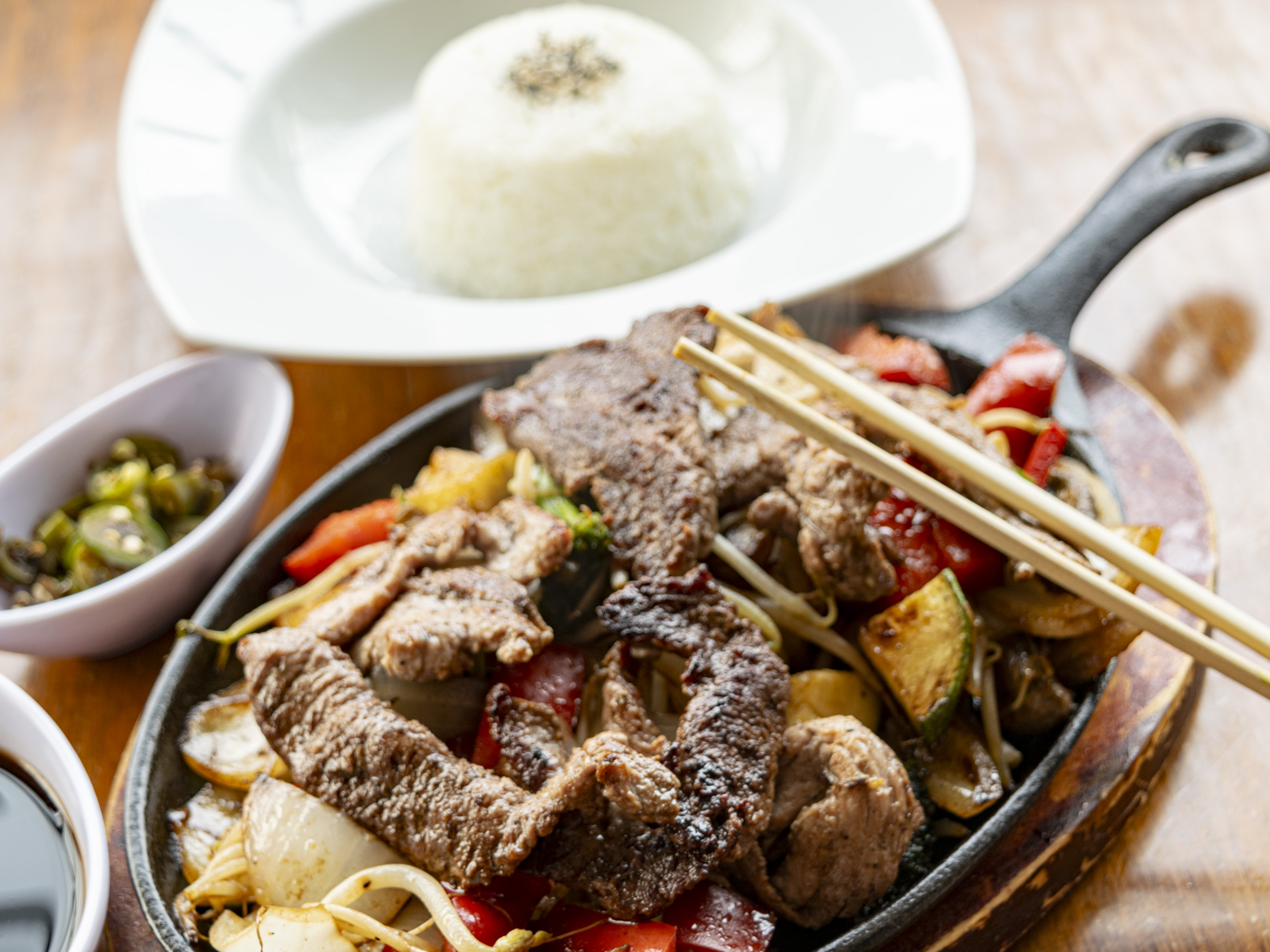 Exquisita verduras a la plancha con trozos de filete de res. Acompañado de un arroz gohan.