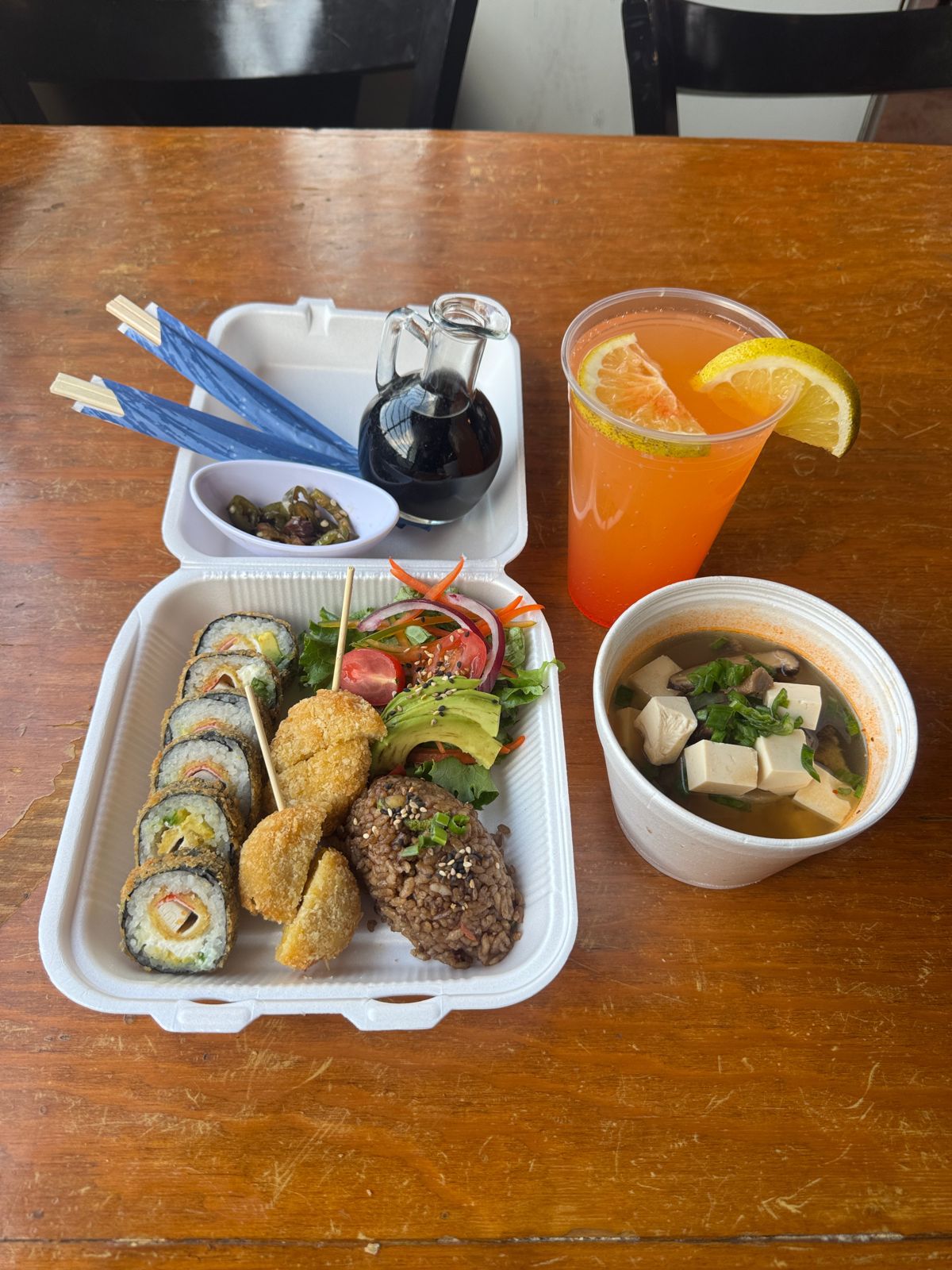 Combo con un california veggie, ensalada, arroz frito, ensalada, sopa misoshiru y una naranjada o limonada