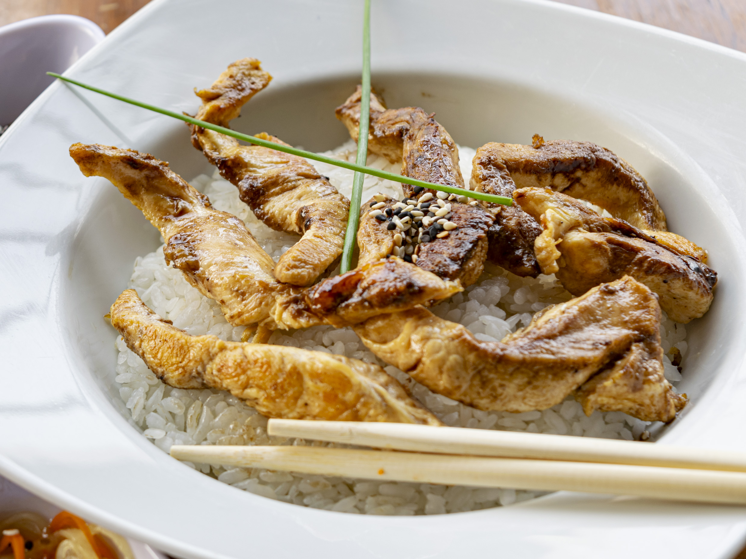 Delicioso arroz blanco al vapor acompañado de tiras de pollo sazonadas con salsa teriyaki y ajonjolí.