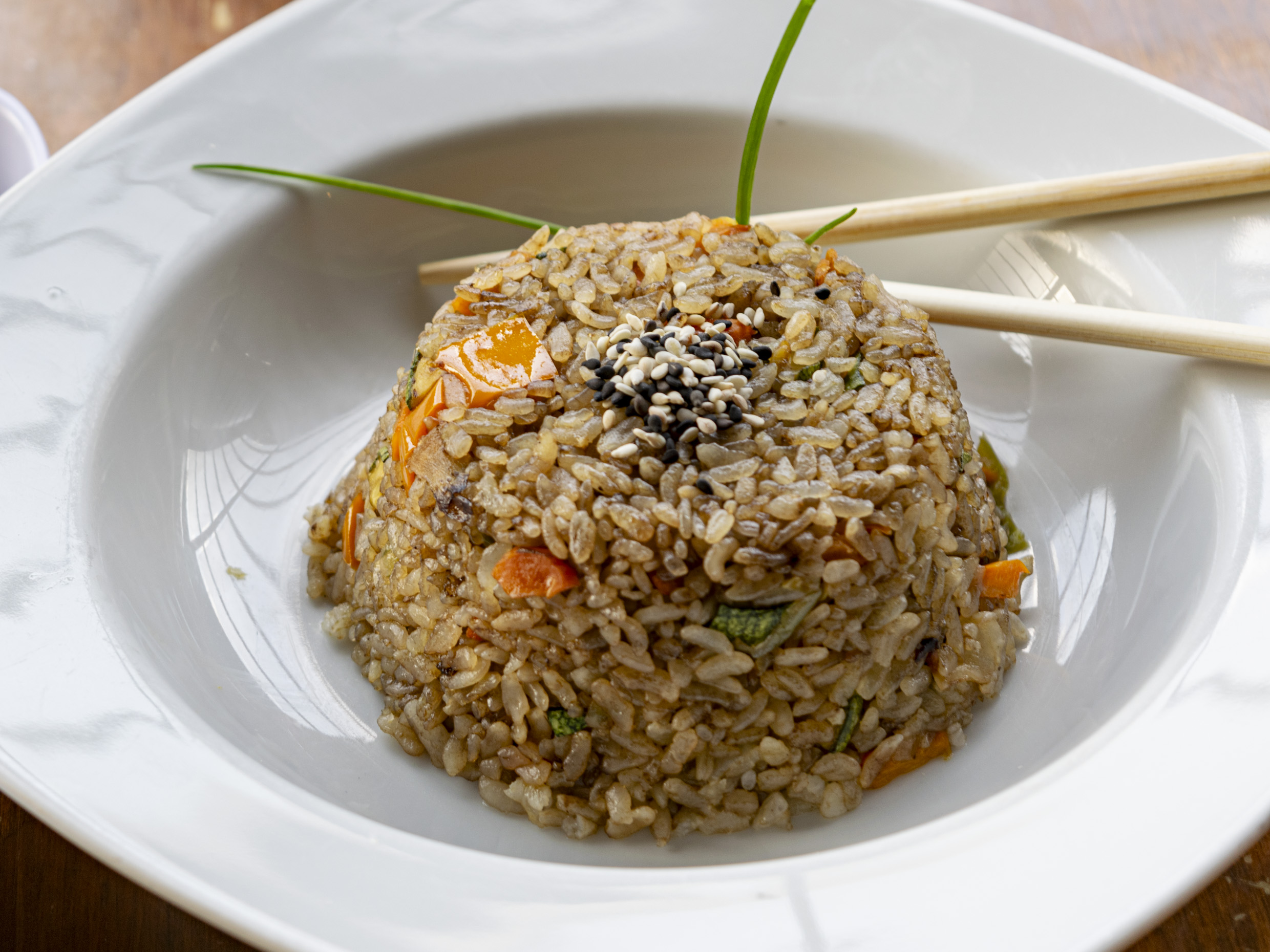 Arroz frito sazonado con soya y verduras, cebolla, calabaza, morrón y zanahoria.
