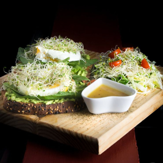 Pan de masa madre, con una cama de aguacate, espinaca, germen y huevos al gusto, acompañado de ensalada
