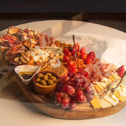 Tabla con waffles, Hotcakes, bagel, fruta de temporada, tocino, huevo, arrachera, quesos, miel maple, y mermelada