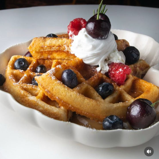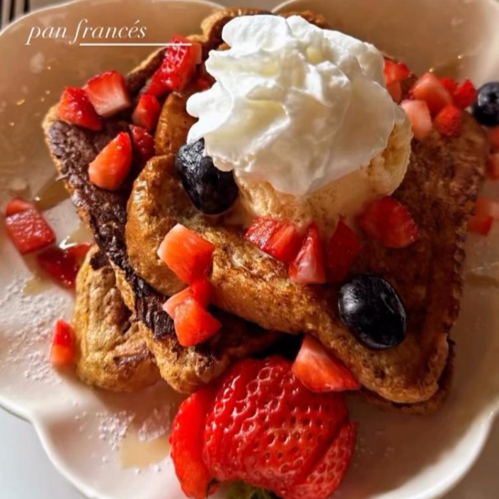 Pan suave con notas de canela, acompañado de frutos rojos, miel maple, azucar glass y helado