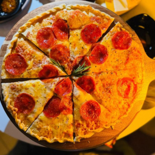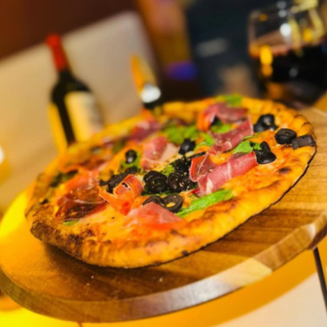 Pan crujiente, gratinados con queso manchego, pepperoni, y salsa pesto
