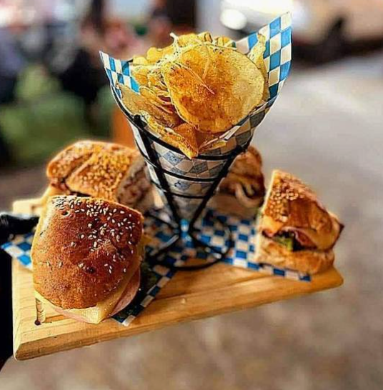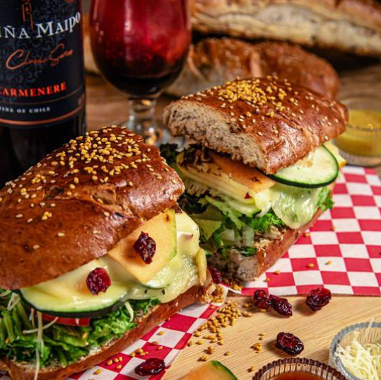 Con el pan de la casa, mayonesa, pesto de albahaca, lechuga, champiñones asados, cebolla, queso gouda, y pollo a la plancha.