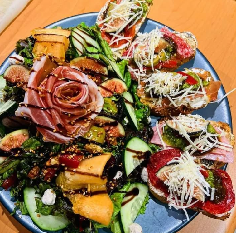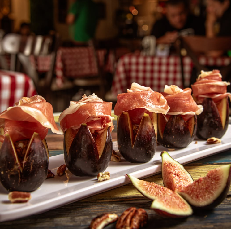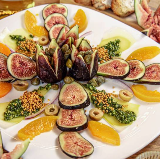 Láminas de jamón serrano, higos, pistache, queso de cabra, aderezo con limón amarillo, aceite de olivo extra virgen y arúgula, con un toque de aderezo balsámico de frutos rojos.