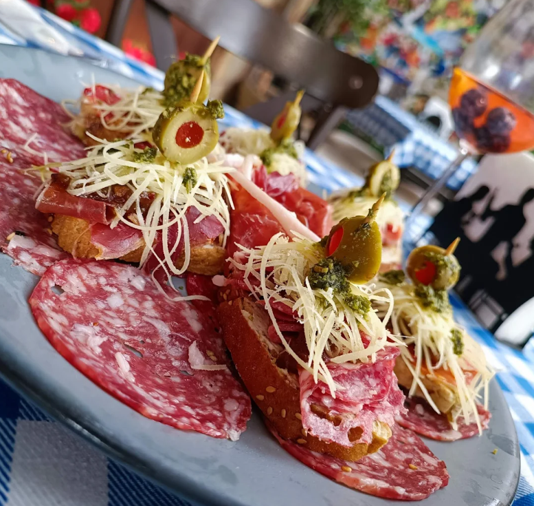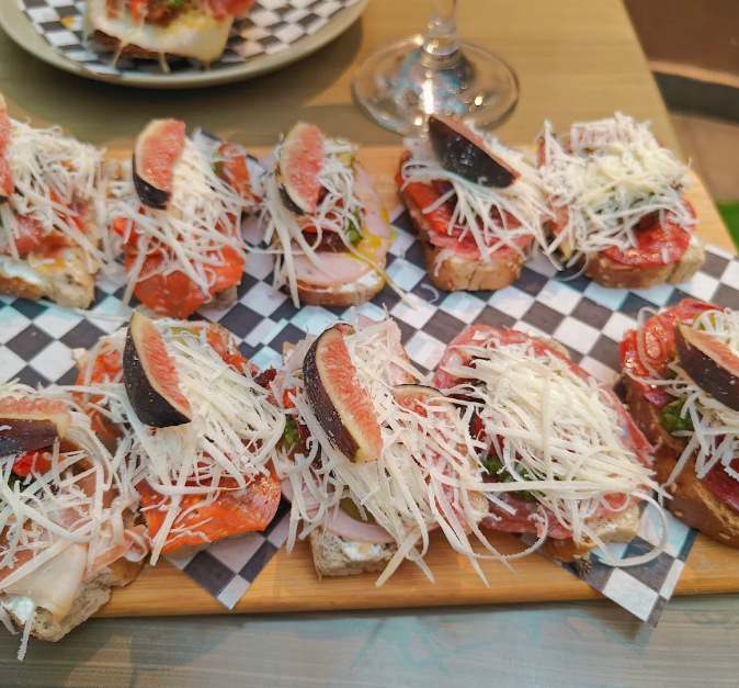 5 Piezas queso parmesano, queso crema, higo, pimiento, aceituna verde, jitomate deshidratado, chipotle de la casa y pesto albahaca, salami, serrano, pamplona, lomo y selva negra..
