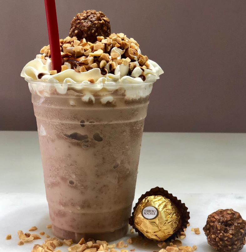 Frappe de vainilla, con crema batida y un chocolate a elegir de conejito, ferrero o kit kat.