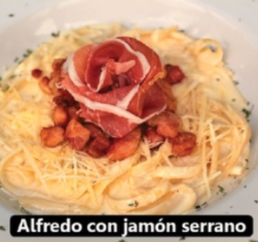 Exquisita salsa cremosa de queso parmesano recién rallado, cubos de panceta italiana y más queso parmesano rallado en tu mesa.