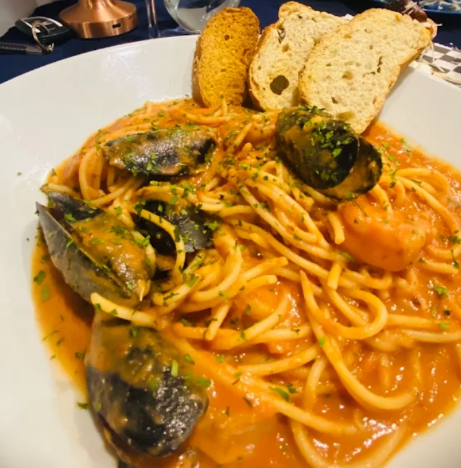 Nuestra especialidad, aceitunas negras, pimiento morrón, perejil, tomates cherry, camarones y mejillones, salteados a la mantequilla, con salsa pomodoro y chiles secos.