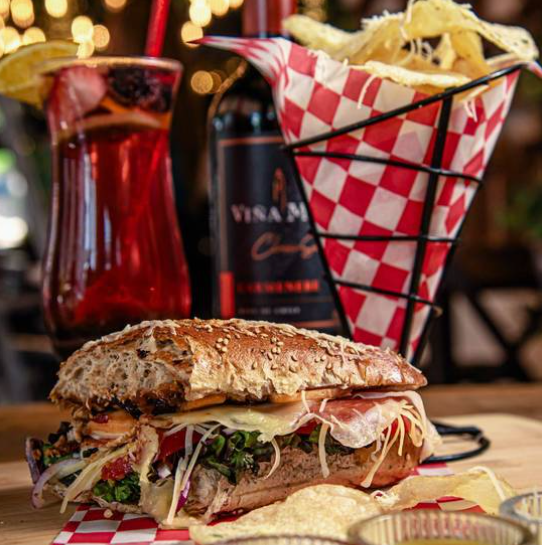 Con el pan de la casa, mayonesa, pesto de albahaca, lechuga, jitomate, pimientos asados, cebolla, queso gouda y arrachera.