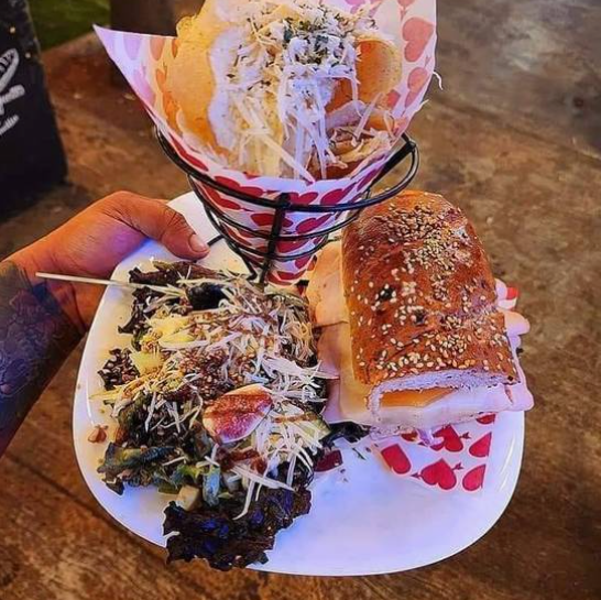 Media baguette de 1 proteína, acompañado de ensalada fresca y un poco de pasta a la crema.