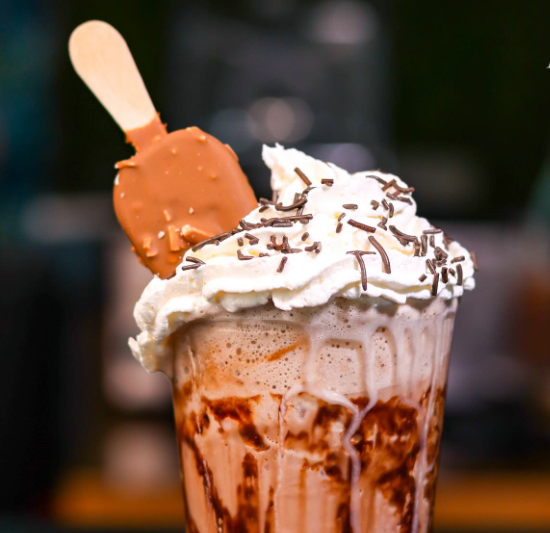 Frappe de chocolate, con crema batida y una paleta magnum.