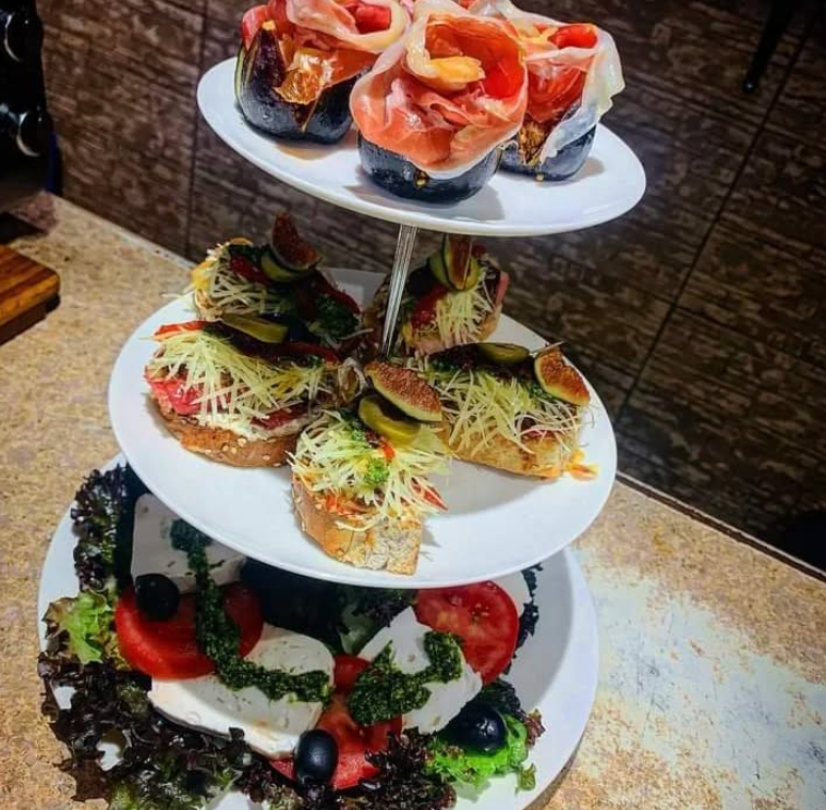 Higos rellenos de queso cabra coronados con jamón serrano y un toque de aderezo balsámico de frutos rojos, un poco de ensalada capres, 8 tapas españolas mixtas, un poco de queso gouda, uvas, semillas y galletas saladas.