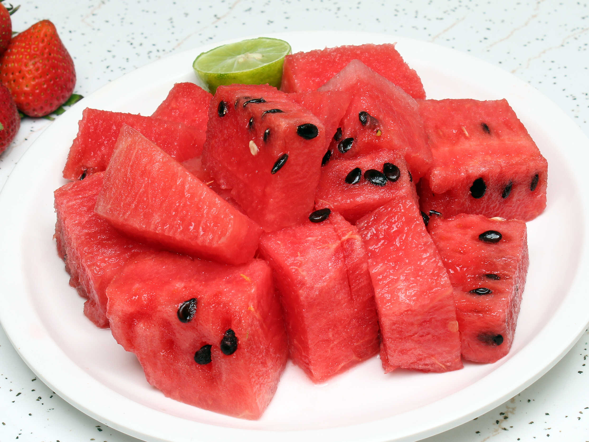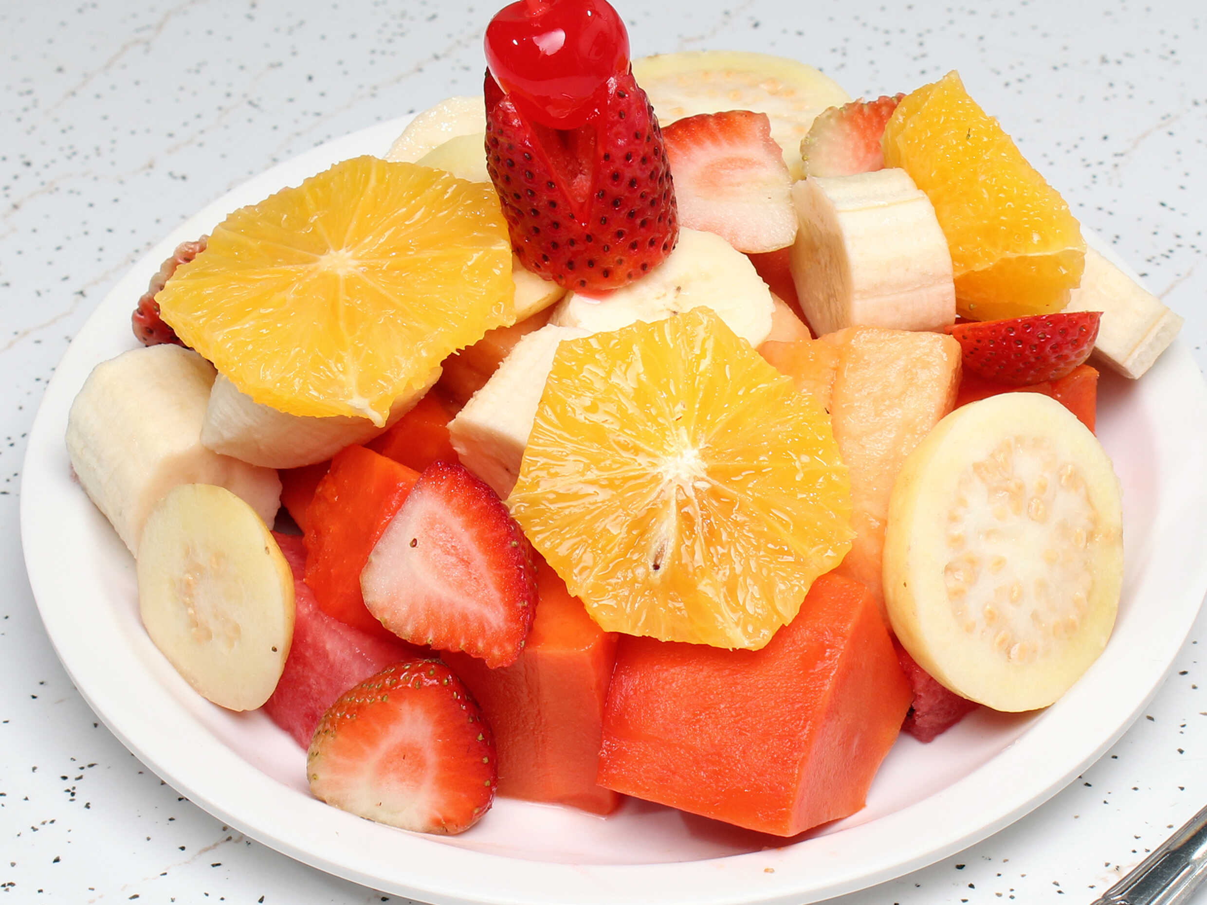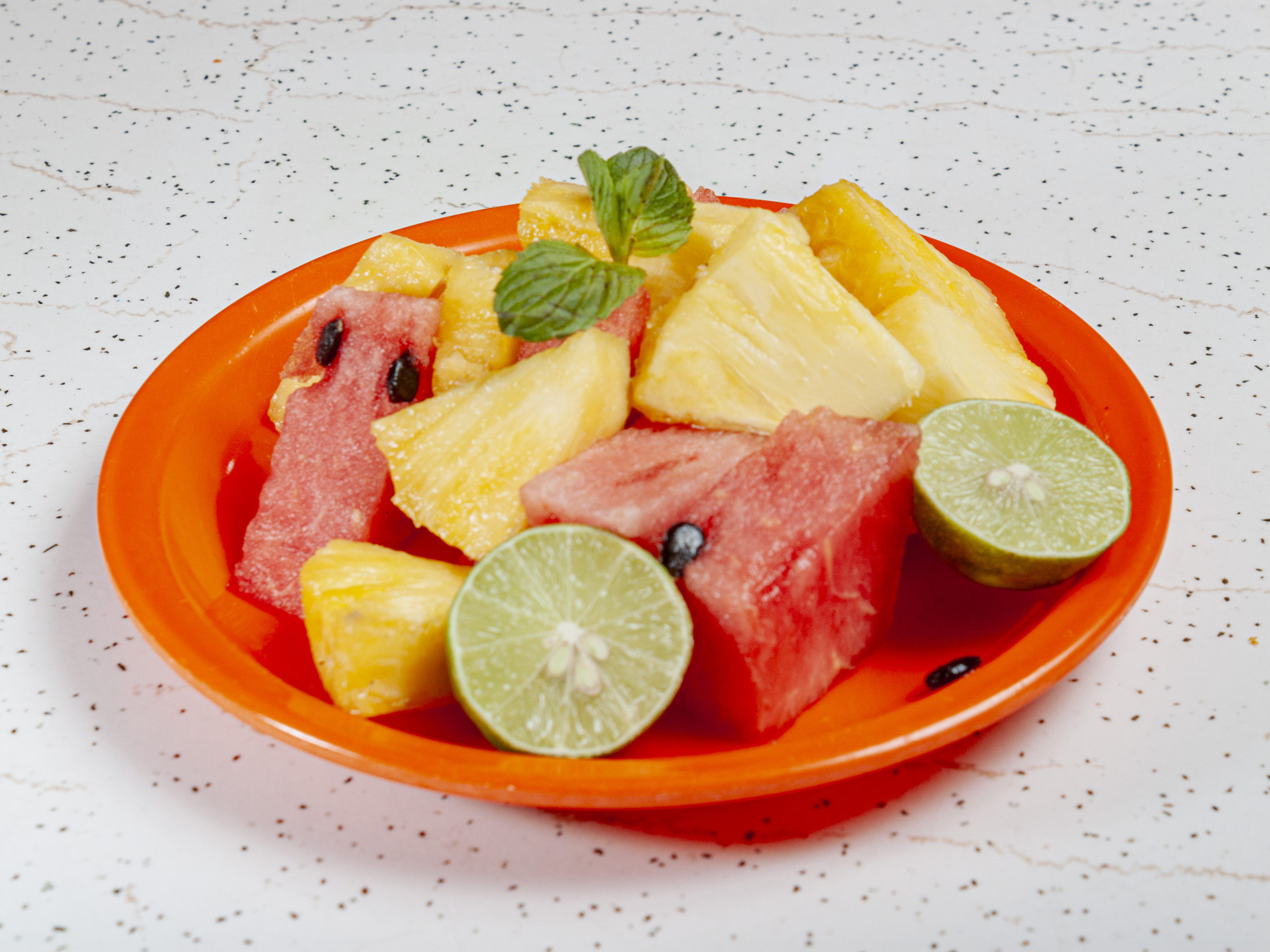 Domo de 14*14cm acompañado de Papaya, melón, sandia, plátano, piña, manzana, guayaba, (fresa, uva, y mango en temporada)