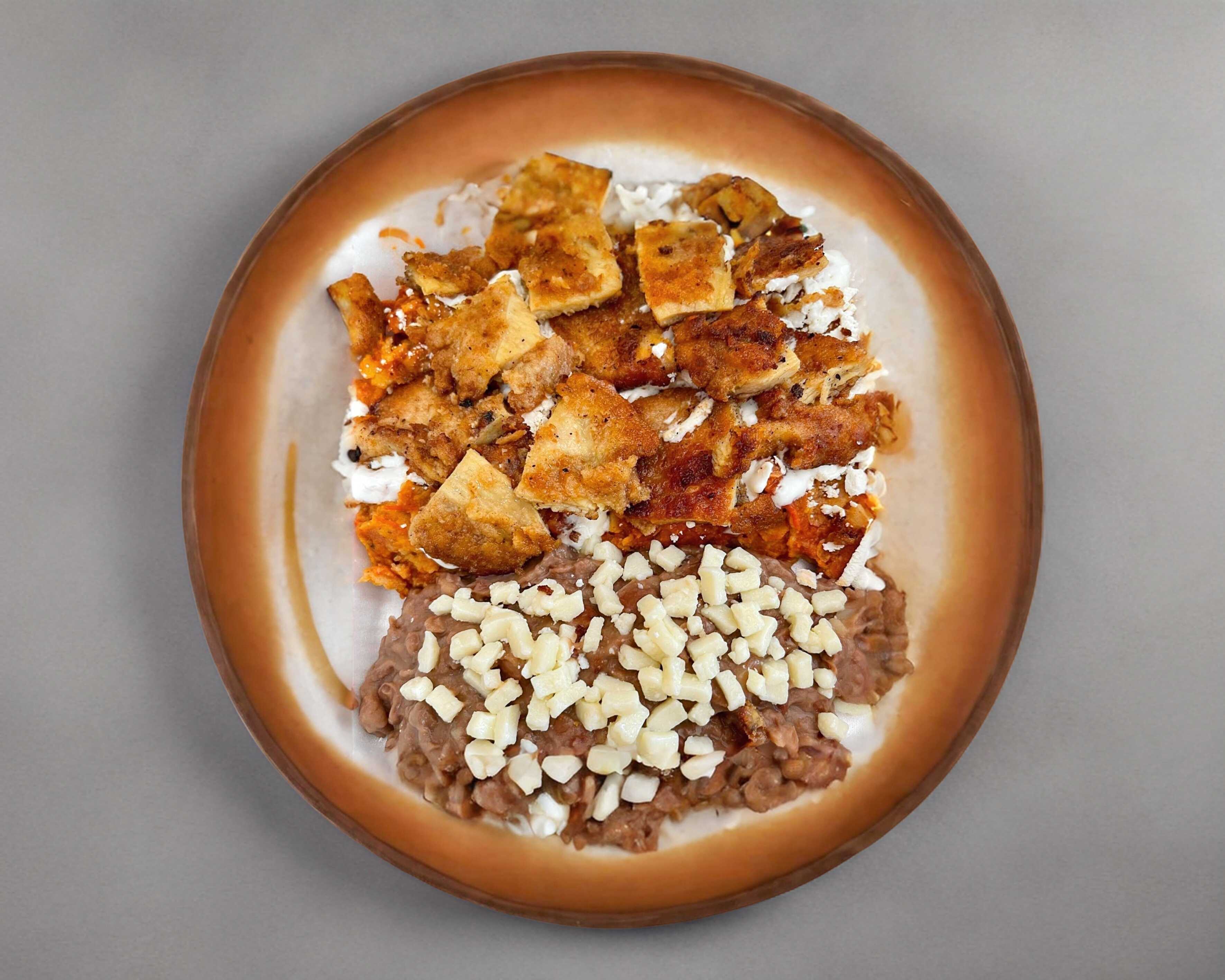Chilaquiles con salsa cremosa y gratinada, acompañados de frijoles y la proteína de tu elección. (Porción personal)