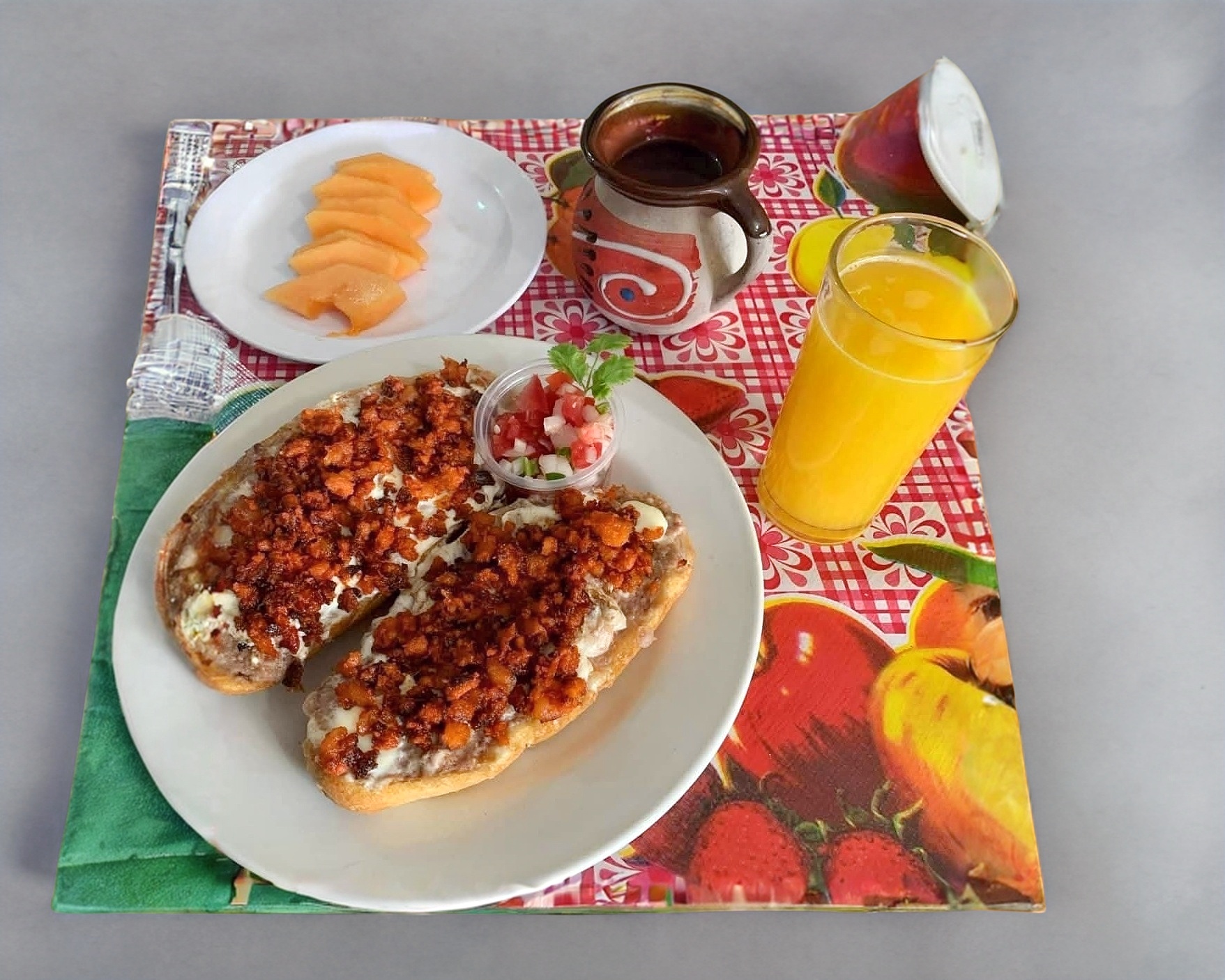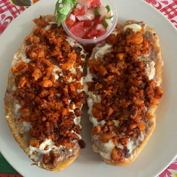 2 Mitades de bolillo con frijol y gratinadas con queso manchego acompañadas de pico de gallo.