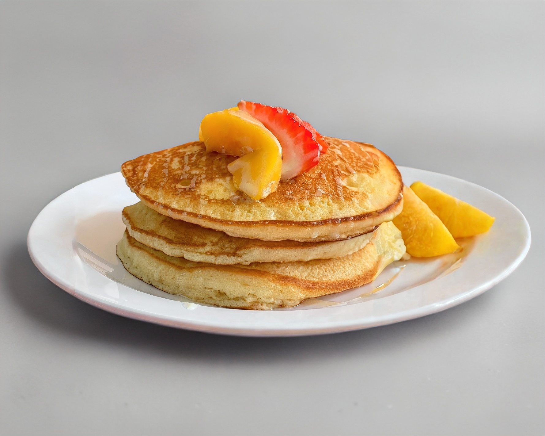 3 deliciosos y esponjados Hotcakes acompañados de jugo de naranja o de temporada, fruta de temporada y cafe de olla