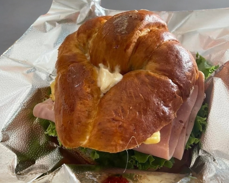 Suave y delicioso bisquet calientito con jamon de pavo, queso manchego, tocino y rajas