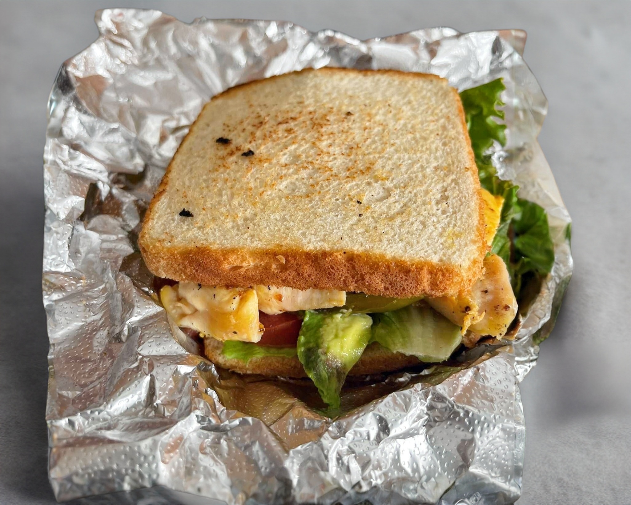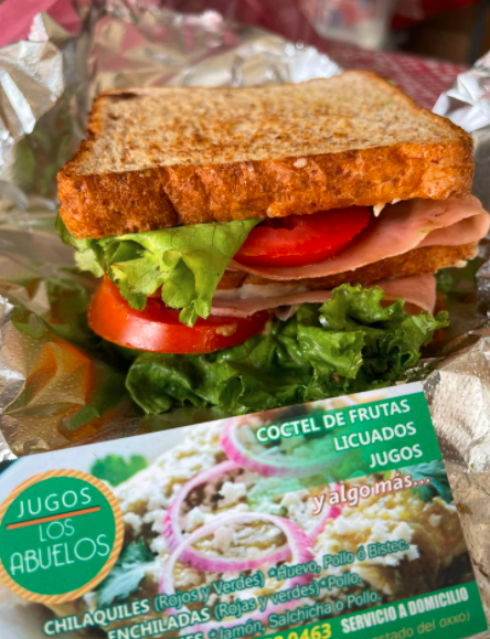 delicioso sandwich calientito de pechuga asada con lechuga, jitomate, aguacate, rajas y queso