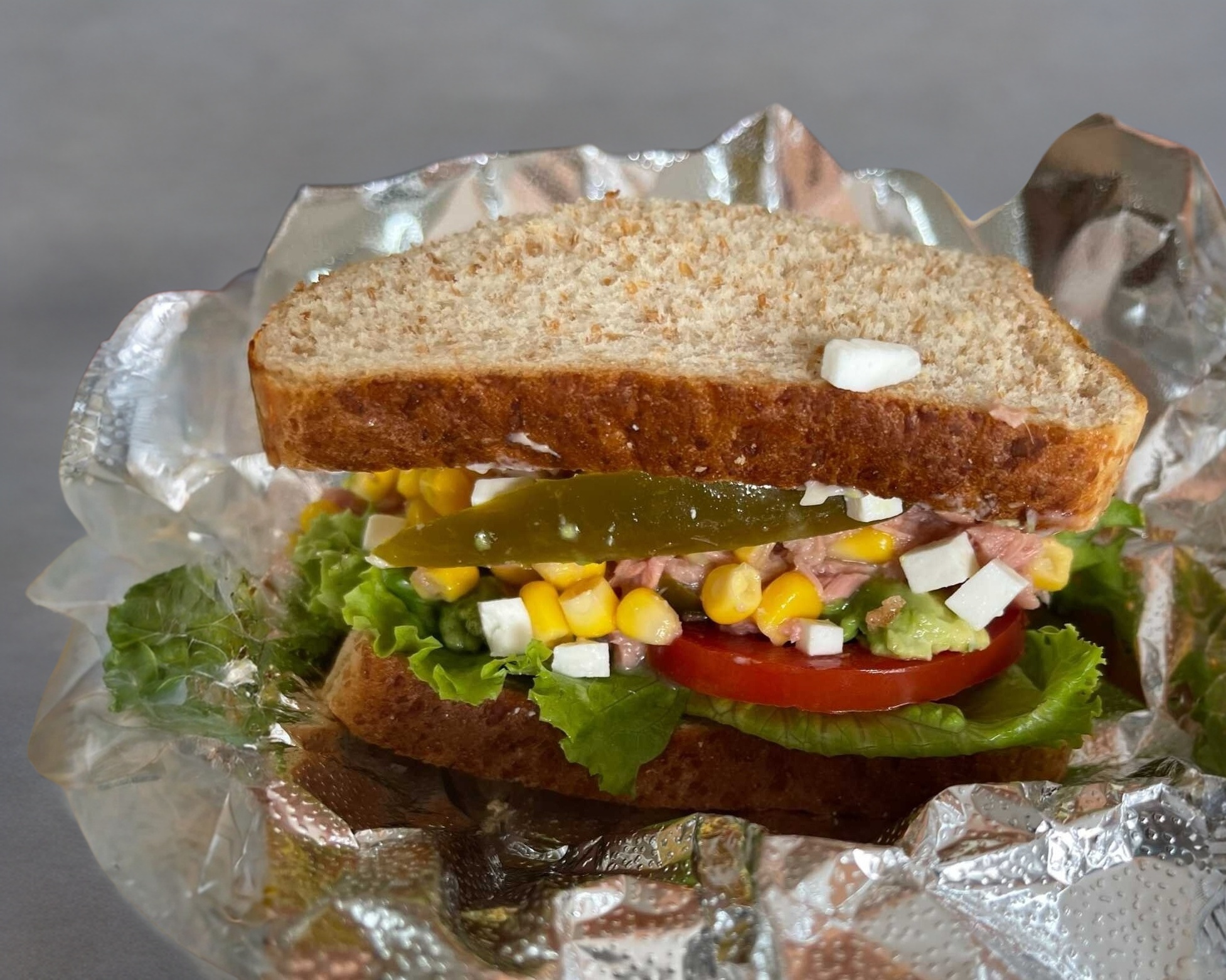 Delicioso y fresco sanwich de atún con queso panela, lechuga, jitomate, aguacate y rajas