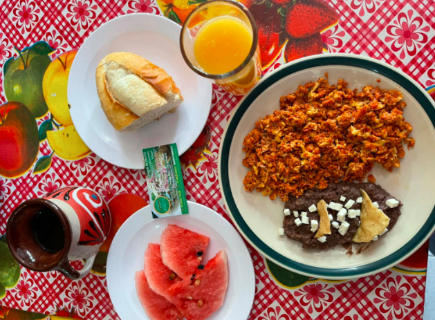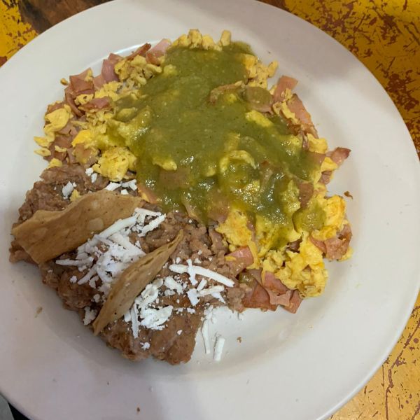 nuestros deliciosos huevos con jamos acompañados de nuestros inigualables chilaquiles acompañados de los frijoles refritos de la abuela