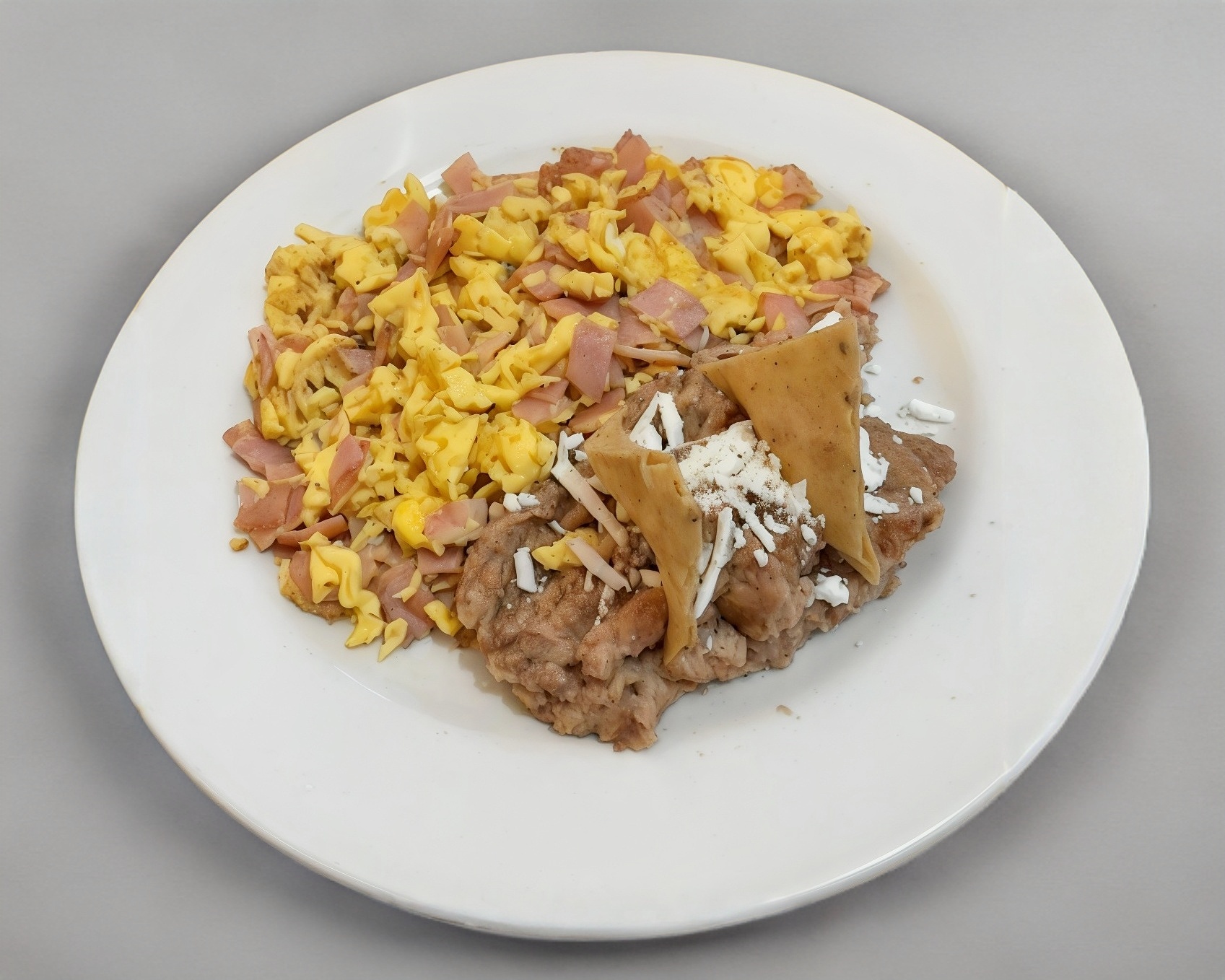2 Piezas de huevo revuelto con jamón de pierna acompañado de frijoles refritos y 1/2 bolillo.