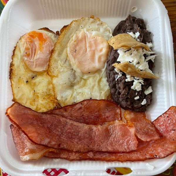 2 Huevos revueltos o estrellados acompañados de tocino, frijoles refritos y 1/2 bolillo.