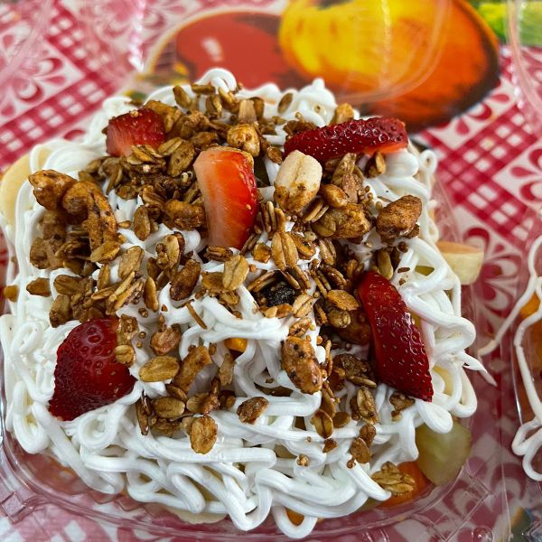 deliciosas frutas de temporada con los toping de tu preferencia