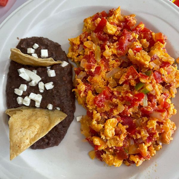 2 Piezas de huevos revueltos con jitomate, cebolla y chile verde acompañados de frijoles refritos con 1/2 bolillo.