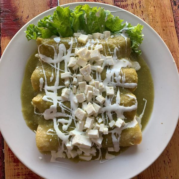 4 Suaves tortillas rellenas de pollo desmenuzado, bañada en una de nuestras salsas acompañadas de 1/2 bolillo.