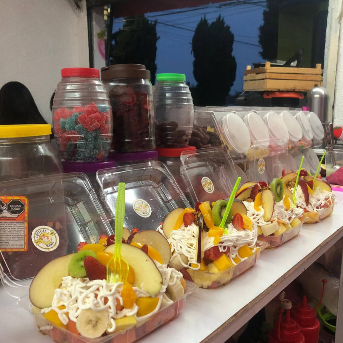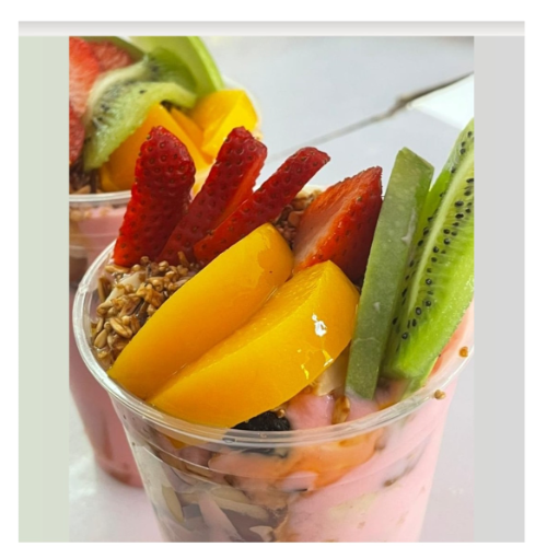 Yogurt de sabor a elegir con fruta picada, melon, papaya, platano, manzana y mango en vaso de 500ml con granola y miel.