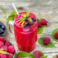 Jugo de naranja, fresa, mora azul y zarzamora.