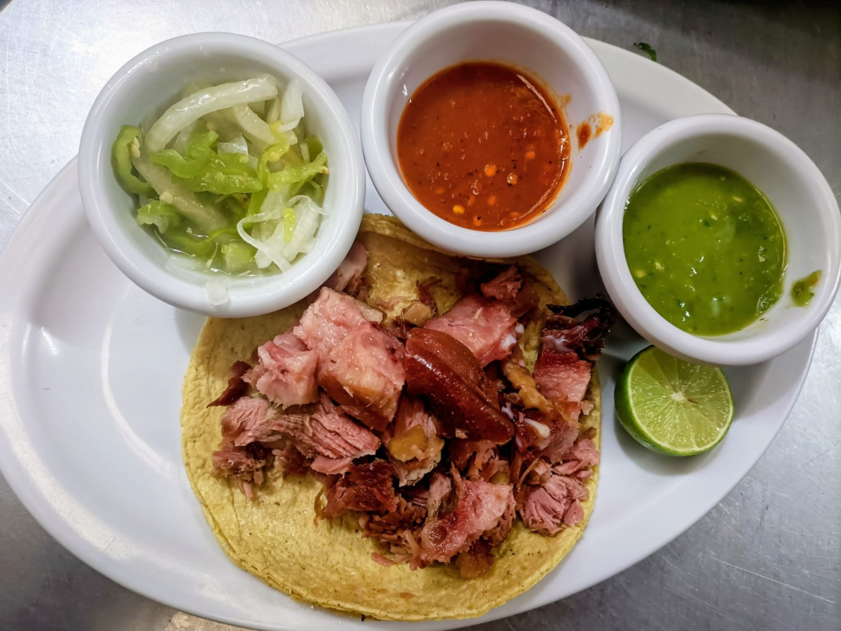 Tortilla de maíz acompañada con carne de cerdo, con cebolla y cilantro.