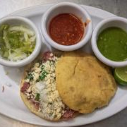 Deliciosa gordita de carnitas, acompañada con limón, cebolla, cilantro y queso.