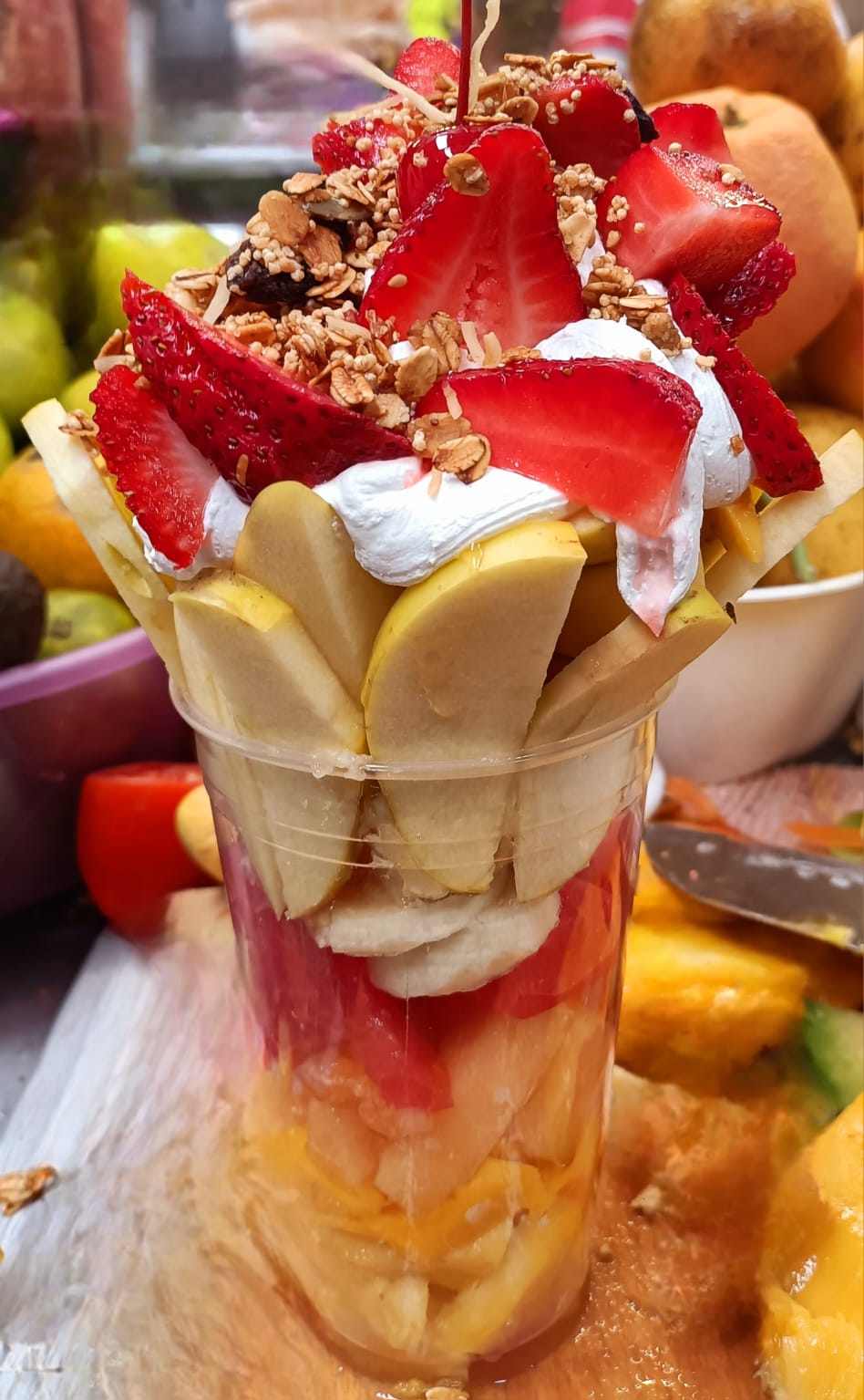 Frutas picadas acompañadas con miel, granola y chantilly.