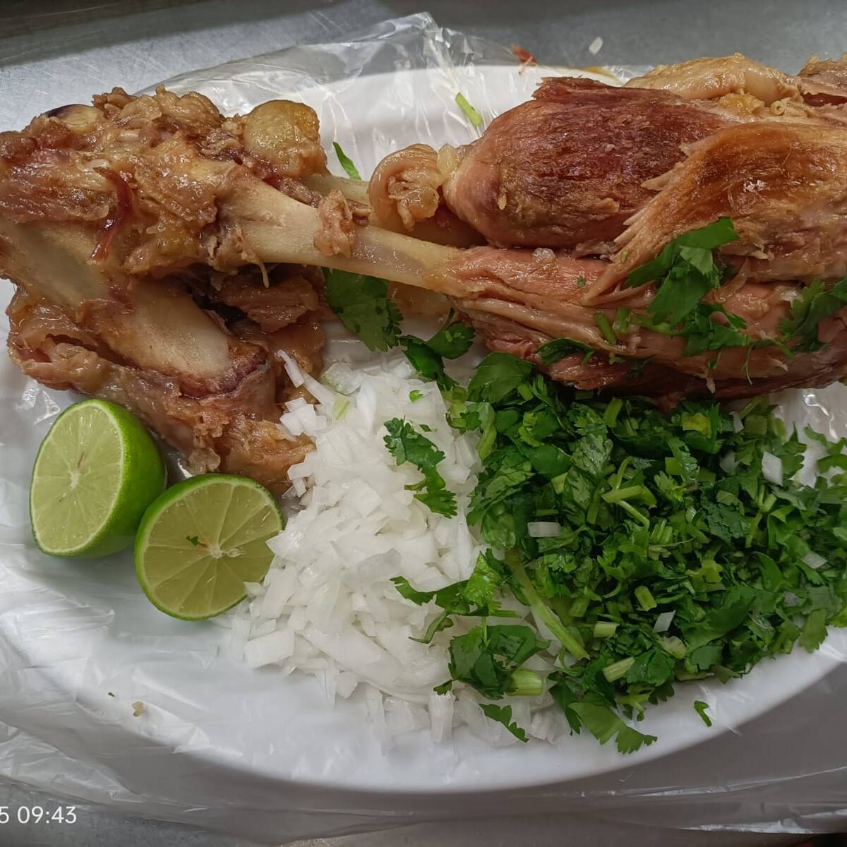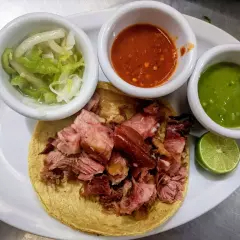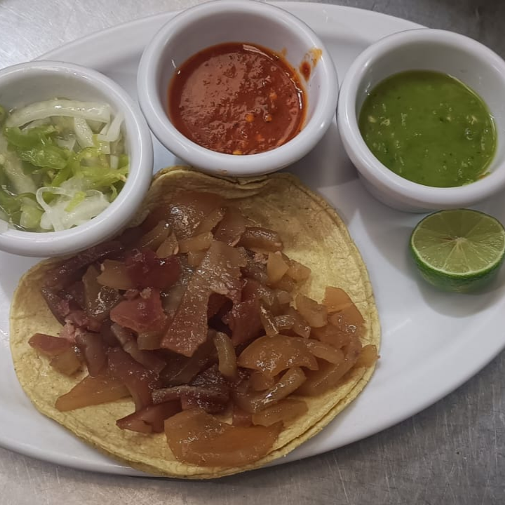 Delicioso chamorro cocido a fuego lento, acompañado de cebolla y cilantro y salsa de tu elección verde o roja y tortillas.