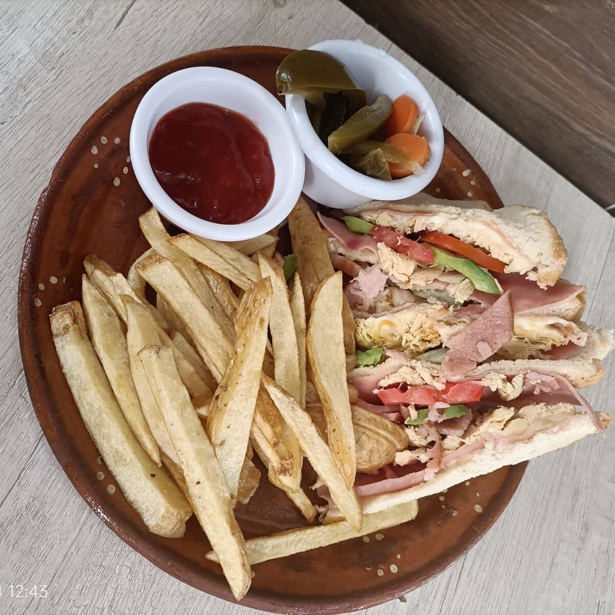 Sándwich con pollo, tocino, jamón, queso Oaxaca, mayonesa, cebolla, jitomate y aguacate acompañado con rajas o chipotle y papas a la francesa.