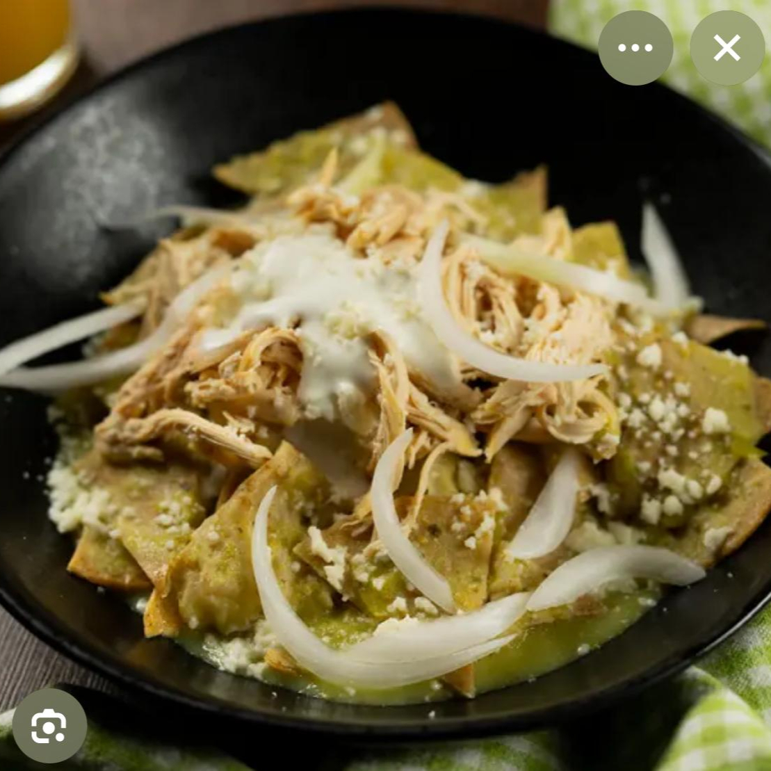Ricos chilaquiles bañados en salsa verde acompañado con bistec o pollo, crema, cebolla y queso.