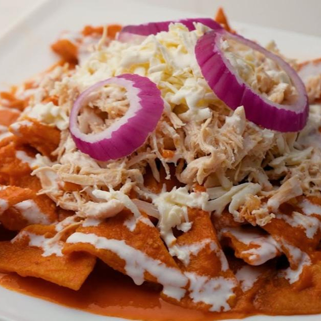deliciosos chilaquiles rojos acompañados con 2 huevos estrellados con crema queso y cebolla