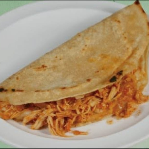 Quesadilla rellena de tinga de pollo hecha de maíz a mano.